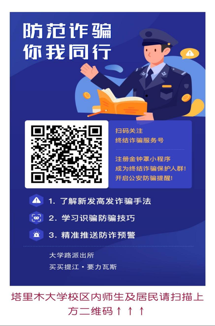 要大力推广诈骗智能预警平台公众号“终结诈骗”,确保每一位师生员工注册公众号下方的“金钟罩”(见附件三),学习宣传“金钟罩”的扫描、注册、登录和使用的演示实操,让广大师生掌握好“金钟罩”的使用方法,要求各单位每位师生关注公众号,注册率要达到100%。保卫部、派出所等有关部门将在教学楼、食堂、校市场门口等人员密集的地方对师生的“金钟罩”安装注册情况进行抽查。