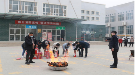 在第四食堂前展开了实操灭火训练,大家用灭火毯灭油锅起火,用灭火器灭木材起火演练,整个演练过程紧张有序。
